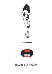 Fig.2 Tattoo, Right Forearm, Image 1: Naked, Bound Lady, Outlined in Black, Image 2: Unknown symbol