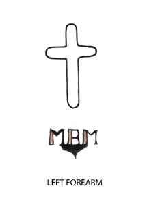 Fig.1, Tattoo, Left Forearm, Image: Black, Outline, Cross Text: MBM or MRM