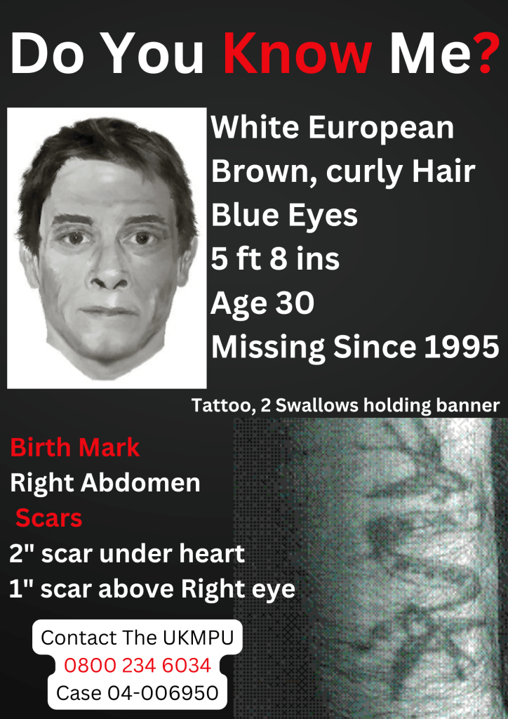 The featured image for this post was recovered from the Doe Network website, this image is not present on the missing persons unit website. The Featured image is a good representation of the artists impression but it is unknown if this was a real photograph or an artists impression. With the quality of the image and the age of the case, this detail may remain unknown. The Missing Persons Unit (UK) really need to update cases on the webiste.
