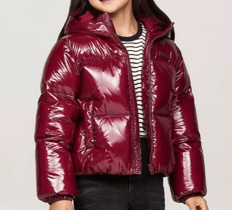 Maroon Bomber Jacket with a zip and fabric cuffs, the material was shiny/plastic appearance.