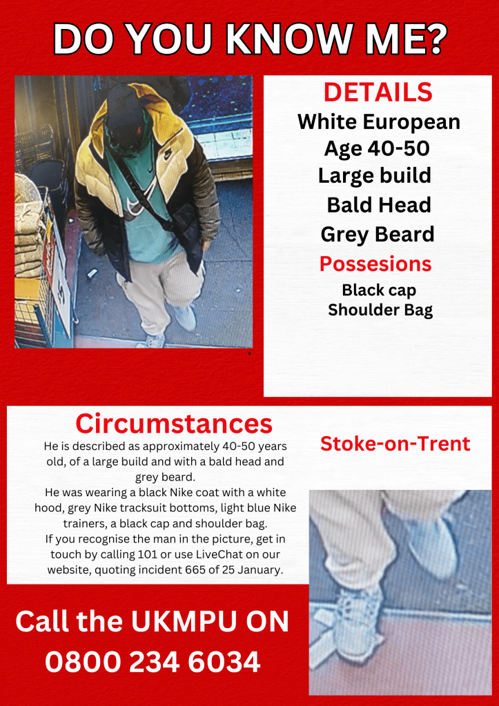 Staffordshire Police say they have exhausted several measures to identify the Unknown male but to date have been unsuccessful. CCTV has been reviewed; DNA tests and other forensics have been performed but it is now Staffordshire Police need the publics help.