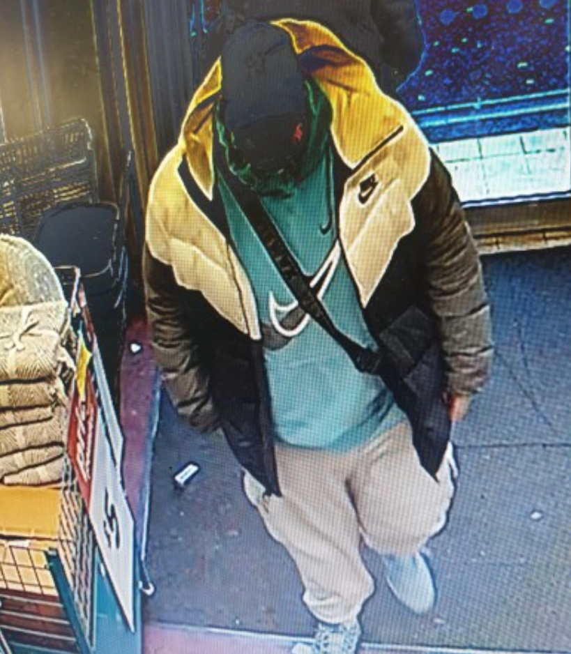 The unidentified male also wore a black Nike coat with a white hood, grey Nike tracksuit bottoms, light blue Nike trainers, a black cap and shoulder bag.