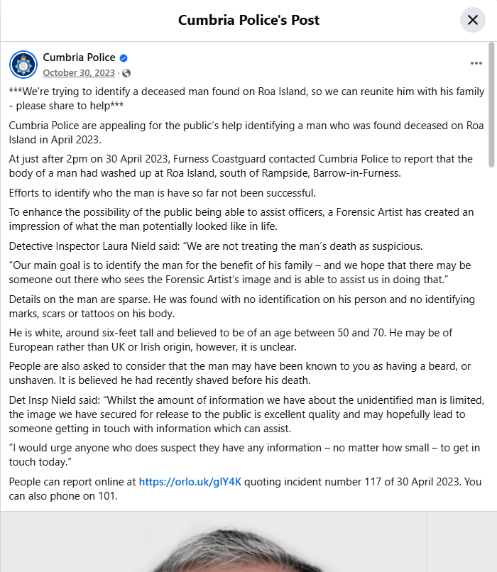 Just after 2pm on the 30th of April 2023, the naked body of a white European male washed up on the shore of a British island known as Roa Island which is located close to Barrow-in-Furness in Cumbria. Although news reports suggest this male was aged between 50 and 60 years old, around 182 cm (5’11) tall, and the UKMPU estimate the unidentified males age between 50 and 70 years old. It is believed the unknown male had thinning grey hair and was also clean shaven (may have recently shaved) with no tattoos, scars or distinguishing marks although he had abrasions to his chest and back, these were said to be post mortem injuries sustained by contact with the seabed. It is believed the unknown male had not been in the water long as his body had not “swollen”.